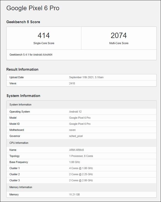 픽셀 6 프로의 긱벤치 점수는 싱글 코어 414, 멀티 코어 2074로 엑시노스 2100이나 스냅드래곤 888이 싱글 코어는 1000 초반, 멀티코어는 3300대 인 것과 비교하면 제법 낮은 점수입니다.
