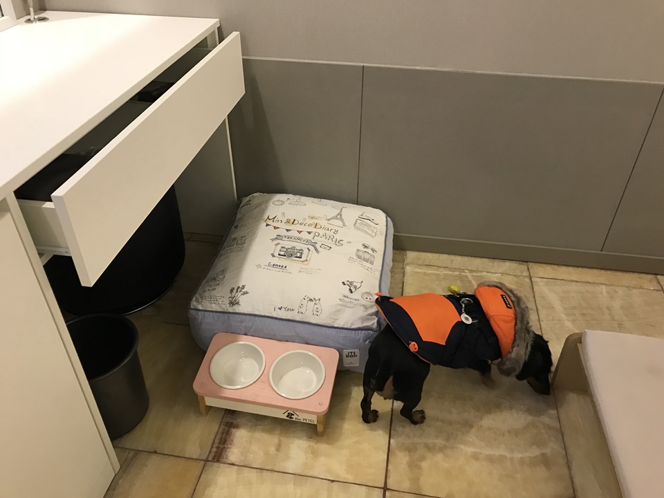 객실에 반려견을 위한 세팅(방석 및 식기)을 위한 부분으로 보입니다.