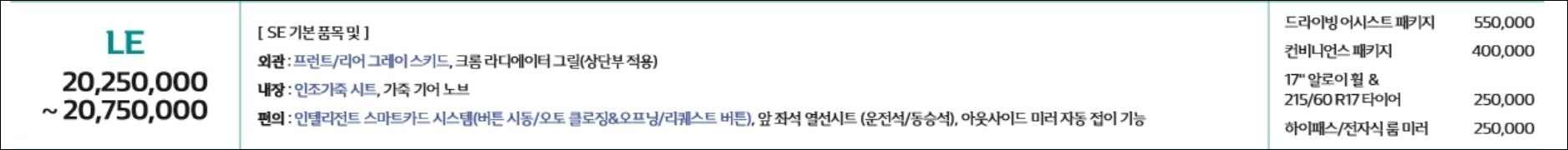 LE 트림부터 선택옵션 패키지가 준비되어 있습니다.