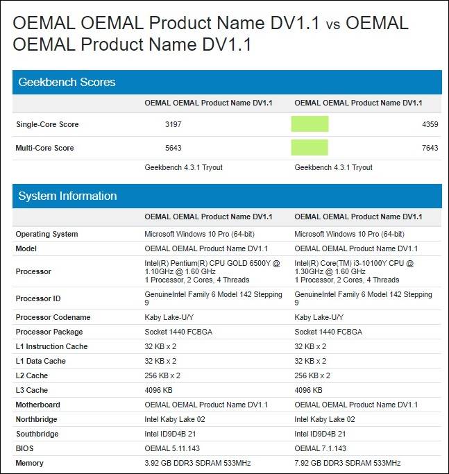확인된 긱벤치 데이터베이스에는 서피스 고 3라는 이름으로 표기된 것이 아닌 OEM 라벨을 사용하였습니다.