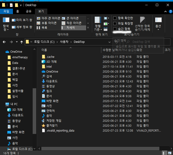 숨긴 항목을 체크하면 보이지 않던 숨어있는 폴더와 파일이 나타나게 됩니다.