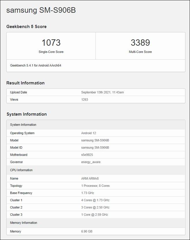 긱벤치 데이터베이스에서 발견된 SM-S906B는 갤럭시 S22의 모델넘버로 추정이 됩니다.