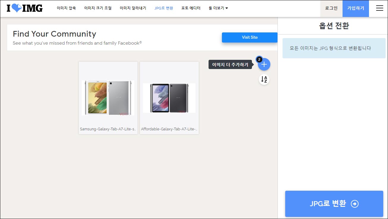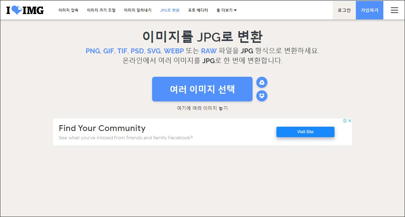 웹사이트 상단 메뉴에 있는 JPG로 변환을 클릭하면 위와 같은 화면으로 바뀝니다.