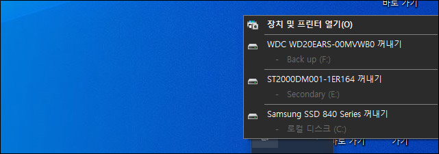 위와 같이 컴퓨터 안에 설치된 HDD 부터 SDD 까지 모두 이동식 드라이브로 윈도우10이 인식을 했습니다.