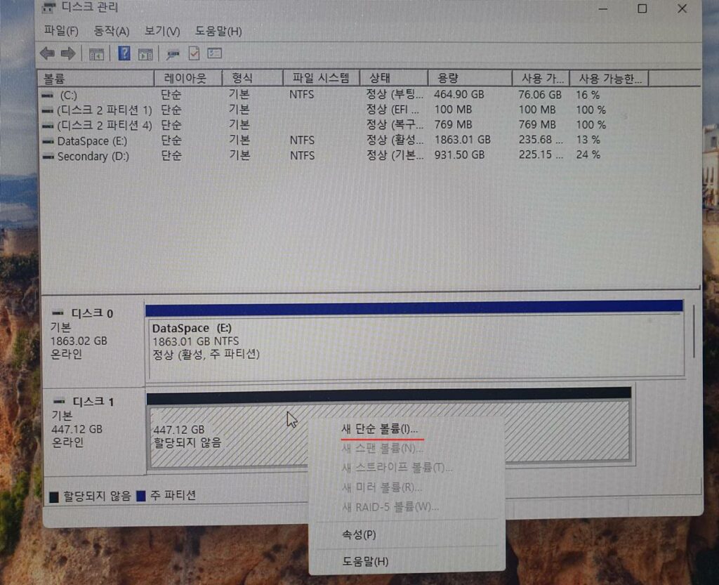 위와 같은 방법으로 윈도우11에 새로 구입한 SSD를 추가할 수 있습니다.