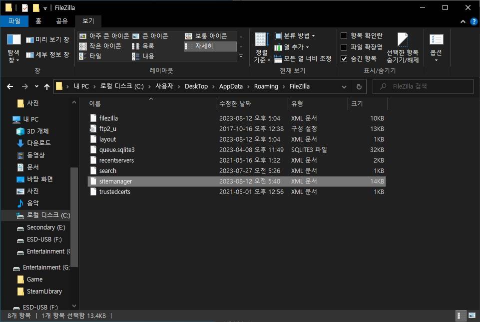 파일질라 사이트 관리자의 정보는 위 이미지에서 확인할 수 있는 폴더에 저장이 됩니다.