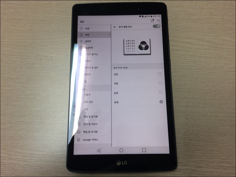 설정에서 LG 에서 자랑을 하는 4단계 리더모드로 바꾸어 봅니다.